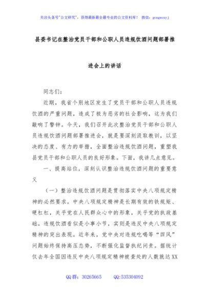 / 县委书记在整治党员干部和公职人员违规饮酒问题部署推进会上的讲话