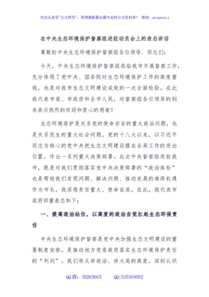 / 在中央生态环境保护督察组进驻动员会上的表态讲话