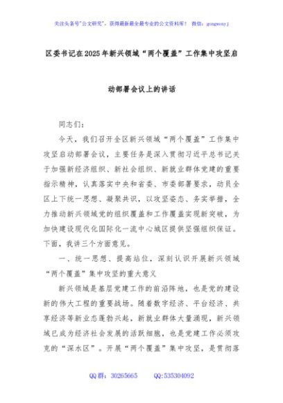 / 区委书记在2025年新兴领域“两个覆盖”工作集中攻坚启动部署会议上的讲话