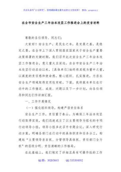 / 在全市安全生产三年治本攻坚工作推进会上的发言材料