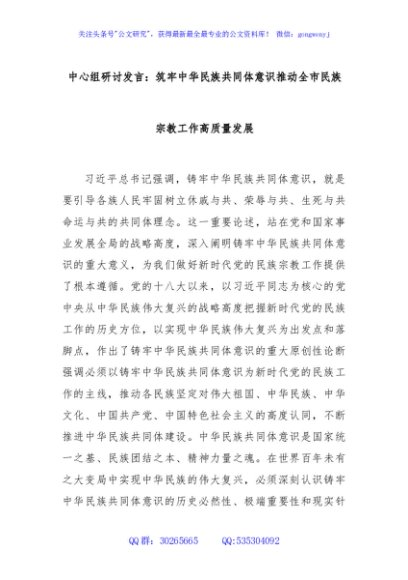 中心组研讨发言:筑牢中华民族共同体意识推动全市民族宗教工作高质量发展
