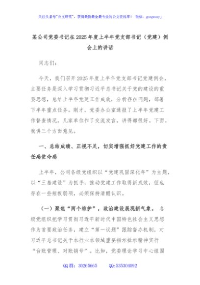 / 某公司党委书记在2025年度上半年党支部书记(党建)例会上的讲话