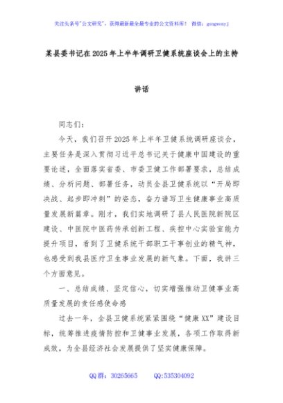 / 某县委书记在2025年上半年调研卫健系统座谈会上的主持讲话