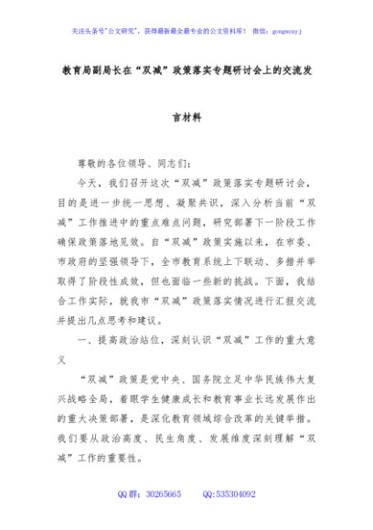 / 教育局副局长在“双减”政策落实专题研讨会上的交流发言材料