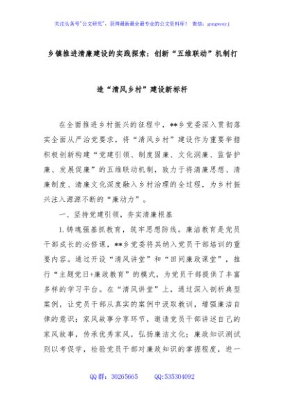 / 乡镇推进清廉建设的实践探索:创新“五维联动”机制打造“清风乡村”建设新标杆