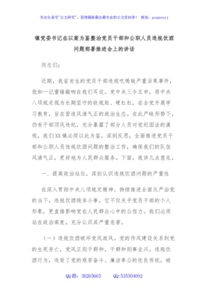 / 镇党委书记在以案为鉴整治党员干部和公职人员违规饮酒问题部署推进会上的讲话