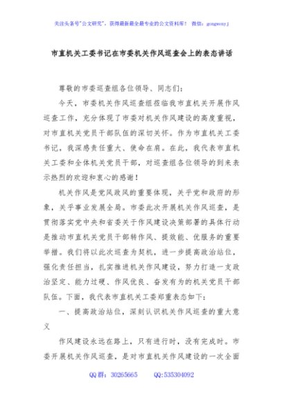 / 市直机关工委书记在市委机关作风巡查会上的表态讲话