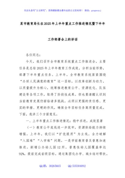 / 某市教育局长在2025年上半年重点工作推进情况暨下半年工作部署会上的讲话