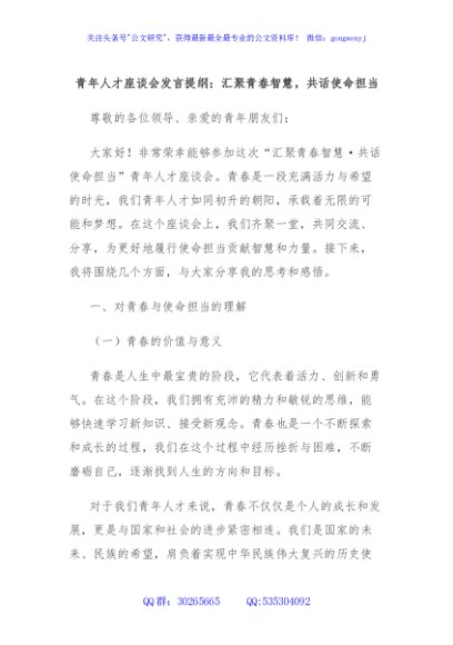 / 青年人才座谈会发言提纲:汇聚青春智慧,共话使命担当