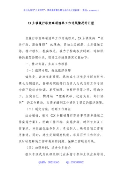 / XX乡镇履行职责事项清单工作进展情况的汇报