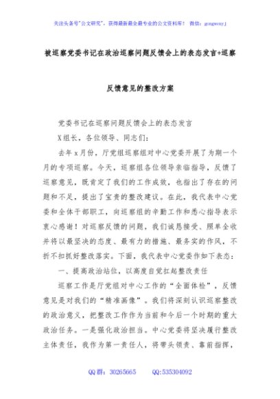/ 被巡察党委书记在政治巡察问题反馈会上的表态发言+巡察反馈意见的整改方案