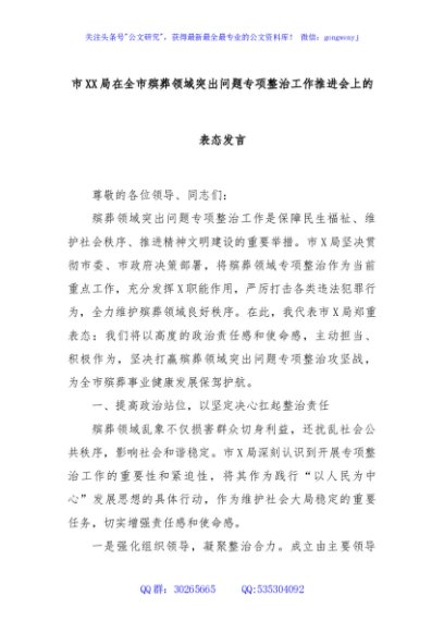 / 市XX局在全市殡葬领域突出问题专项整治工作推进会上的表态发言