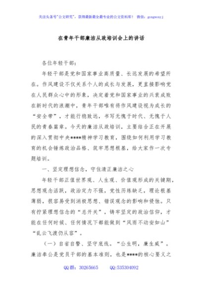 / 在青年干部廉洁从政培训会上的讲话