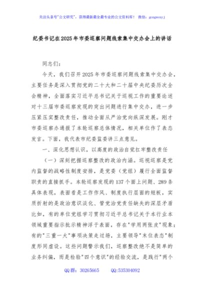 / 纪委书记在2025年市委巡察问题线索集中交办会上的讲话