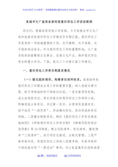 / 某城市文广旅局省委巡视意识形态工作谈话提纲