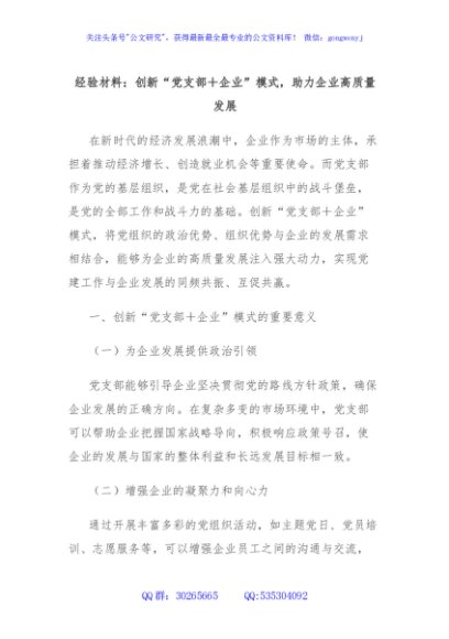/ 经验材料:创新“党支部+企业”模式,助力企业高质量发展