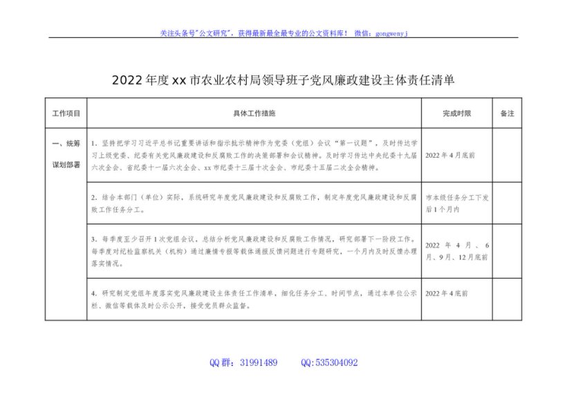 / 2022年度xx市农业农村局领导班子党风廉政建设主体责任清单