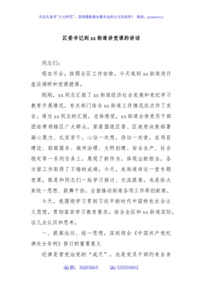 / 区委书记到xx街道讲党课的讲话