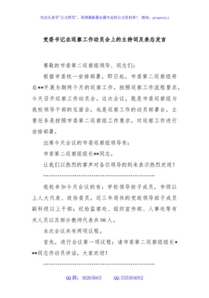 / 党委书记在巡察工作动员会上的主持词及表态发言