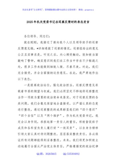 / 2025年机关党委书记在巡察反馈时的表态发言