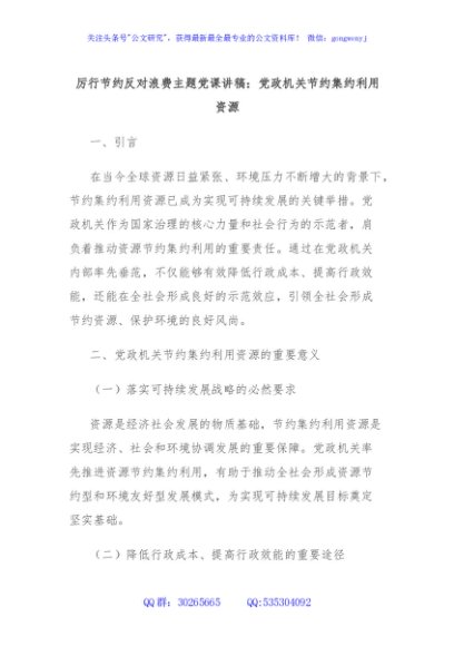 / 厉行节约反对浪费主题党课讲稿:党政机关节约集约利用资源