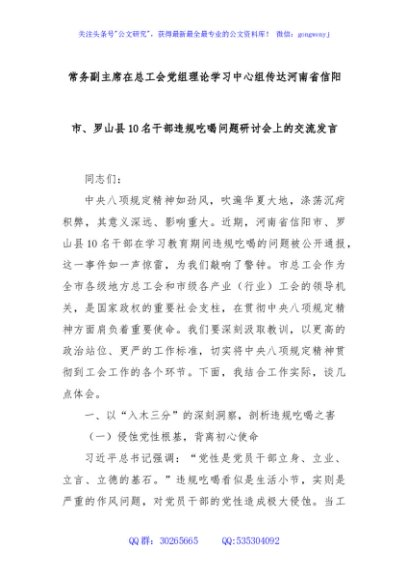 / 常务副主席在总工会党组理论学习中心组传达河南省信阳市、罗山县10名干部违规吃喝问题研讨会上的交流发言