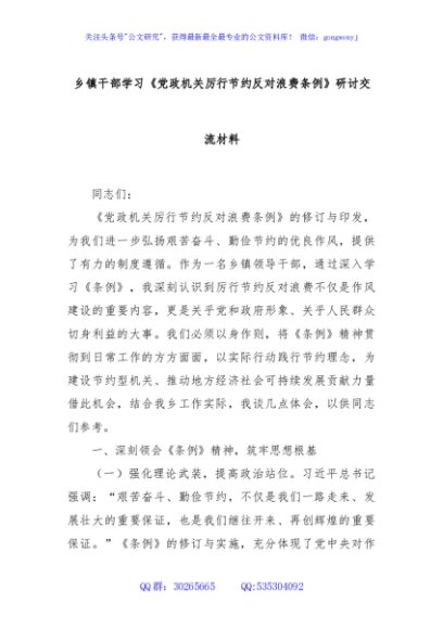/ 乡镇干部学习《党政机关厉行节约反对浪费条例》研讨交流材料