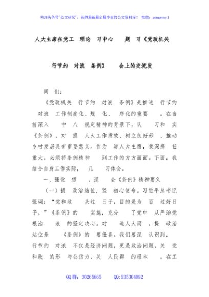 / 人大主席在党工委理论学习中心组专题学习《党政机关厉行节约反对浪费条例》研讨会上的交流发言