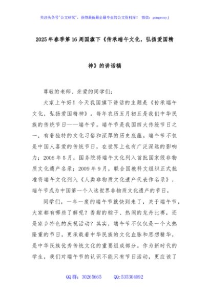 / 2025年春季第16周国旗下《传承端午文化,弘扬爱国精神》的讲话稿