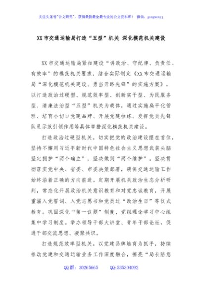 / XX市交通运输局打造“五型”机关 深化模范机关建设