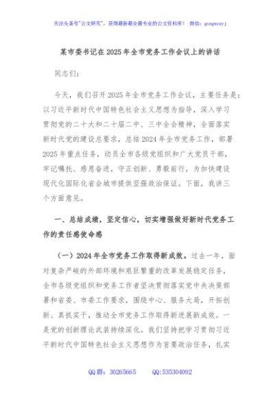 / 某市委书记在2025年全市党务工作会议上的讲话