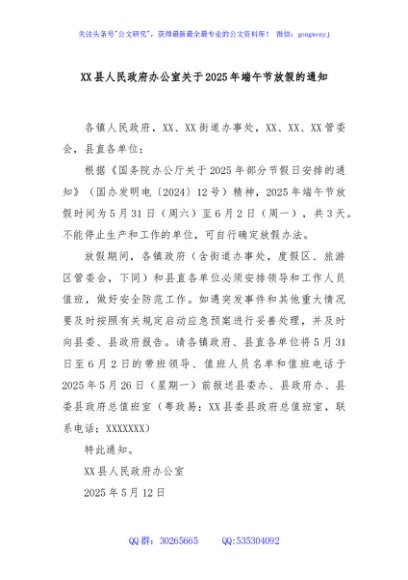/ XX县人民政府办公室关于2025年端午节放假的通知