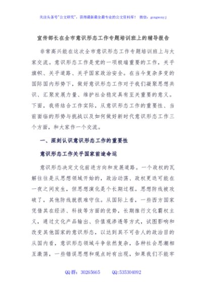 / 宣传部长在全市意识形态工作专题培训班上的辅导报告