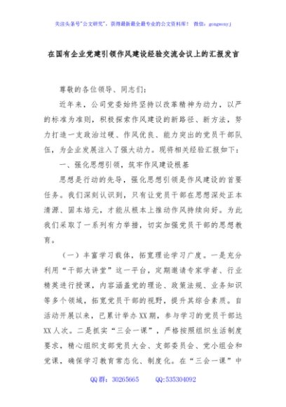 / 在国有企业党建引领作风建设经验交流会议上的汇报发言