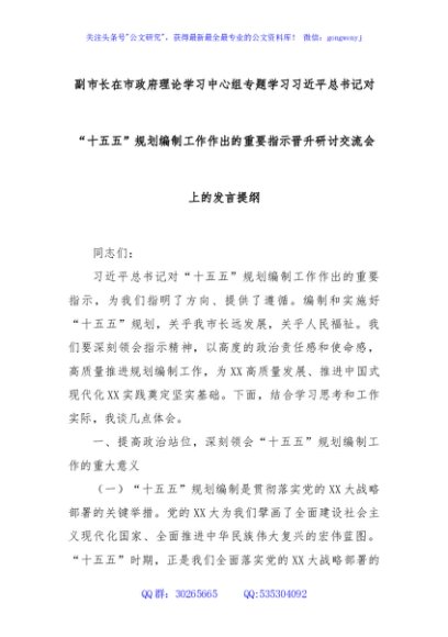 / 副市长在市政府理论学习中心组专题学习习近平总书记对“十五五”规划编制工作作出的重要指示晋升研讨交流会上的发言提纲