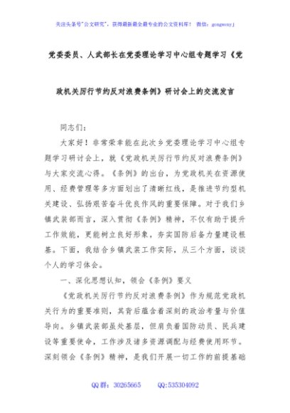 / 党委委员、人武部长在党委理论学习中心组专题学习《党政机关厉行节约反对浪费条例》研讨会上的交流发言