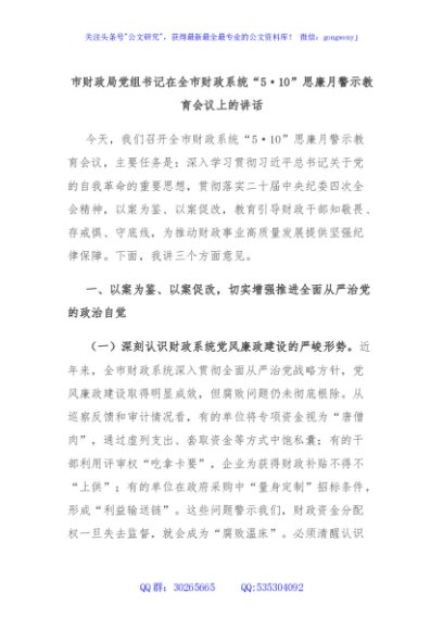 / 市财政局党组书记在全市财政系统“5·10”思廉月警示教育会议上的讲话