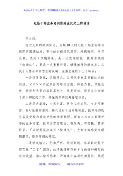 / 纪检干部业务培训班结业仪式上的讲话