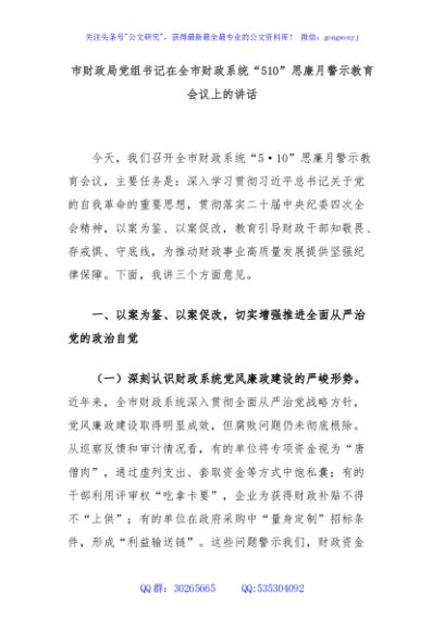 / 市财政局党组书记在全市财政系统“510”思廉月警示教育会议上的讲话
