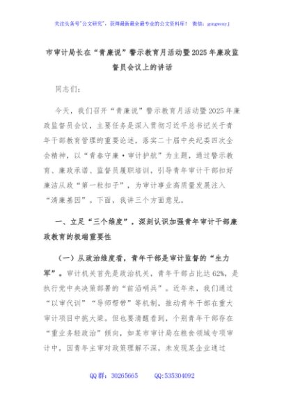 / 市审计局长在“青廉说”警示教育月活动暨2025年廉政监督员会议上的讲话