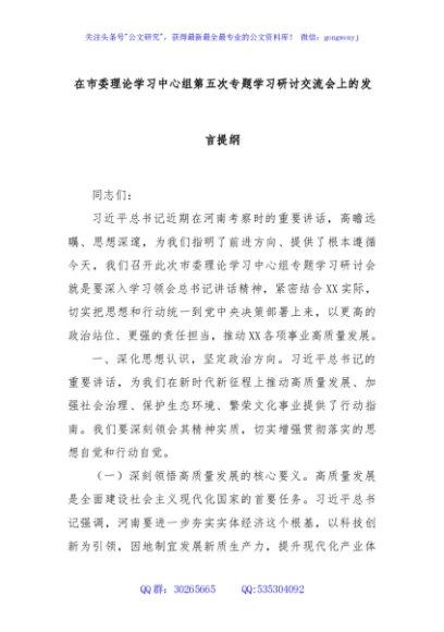 / 在市委理论学习中心组第五次专题学习研讨交流会上的发言提纲