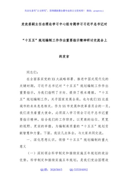 / 发改委副主任在理论学习中心组专题学习习近平总书记对“十五五”规划编制工作作出重要指示精神研讨交流会上的发言