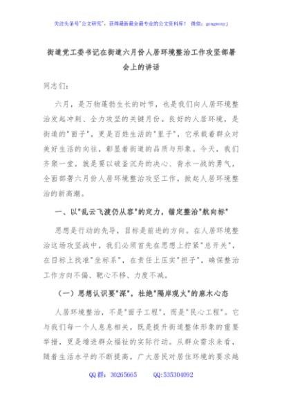 / 街道党工委书记在街道六月份人居环境整治工作攻坚部署会上的讲话