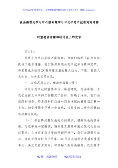 / 在县委理论学习中心组专题学习习近平总书记在河南考察时重要讲话精神研讨会上的发言