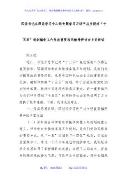 / 区委书记在理论学习中心组专题学习习近平总书记对“十五五”规划编制工作作出重要指示精神研讨会上的讲话