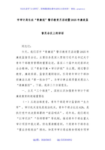 / 市审计局长在“青廉说”警示教育月活动暨2025年廉政监督员会议上的讲话