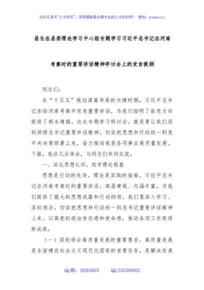 / 县长在县委理论学习中心组专题学习习近平总书记在河南考察时的重要讲话精神研讨会上的发言提纲