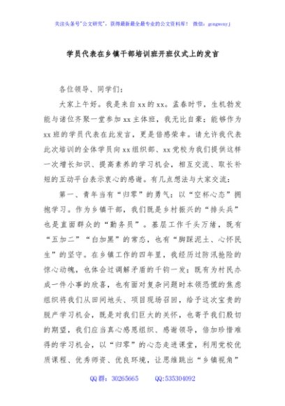 / 学员代表在乡镇干部培训班开班仪式上的发言