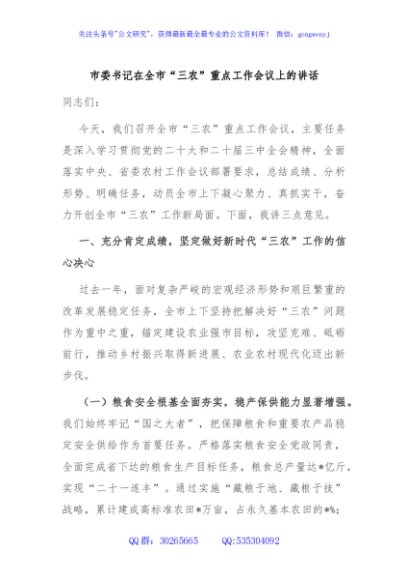/ 市委书记在全市“三农”重点工作会议上的讲话