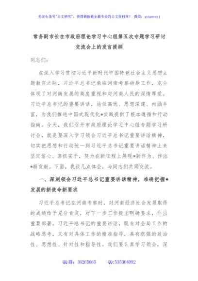 / 常务副市长在市政府理论学习中心组第五次专题学习研讨交流会上的发言提纲